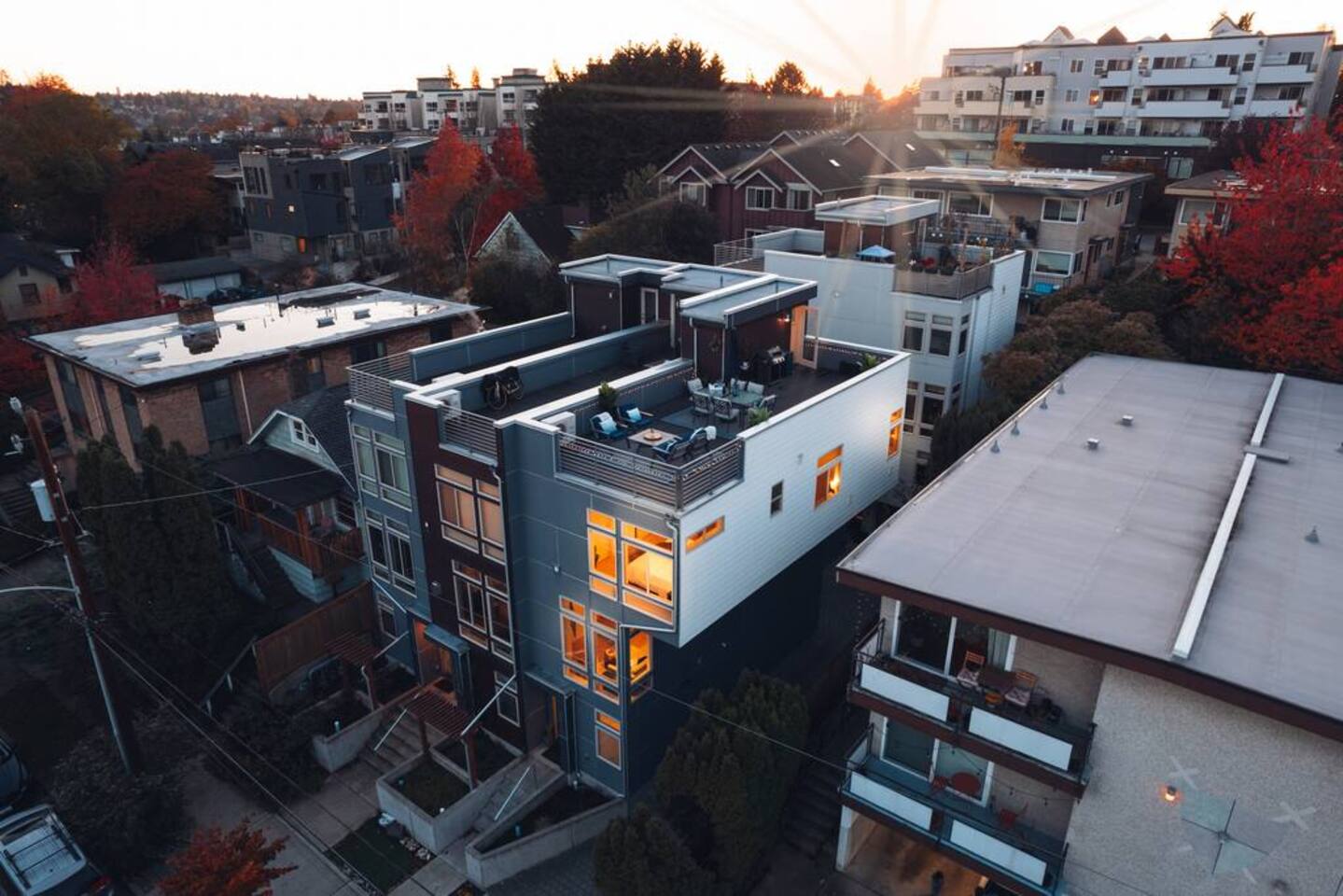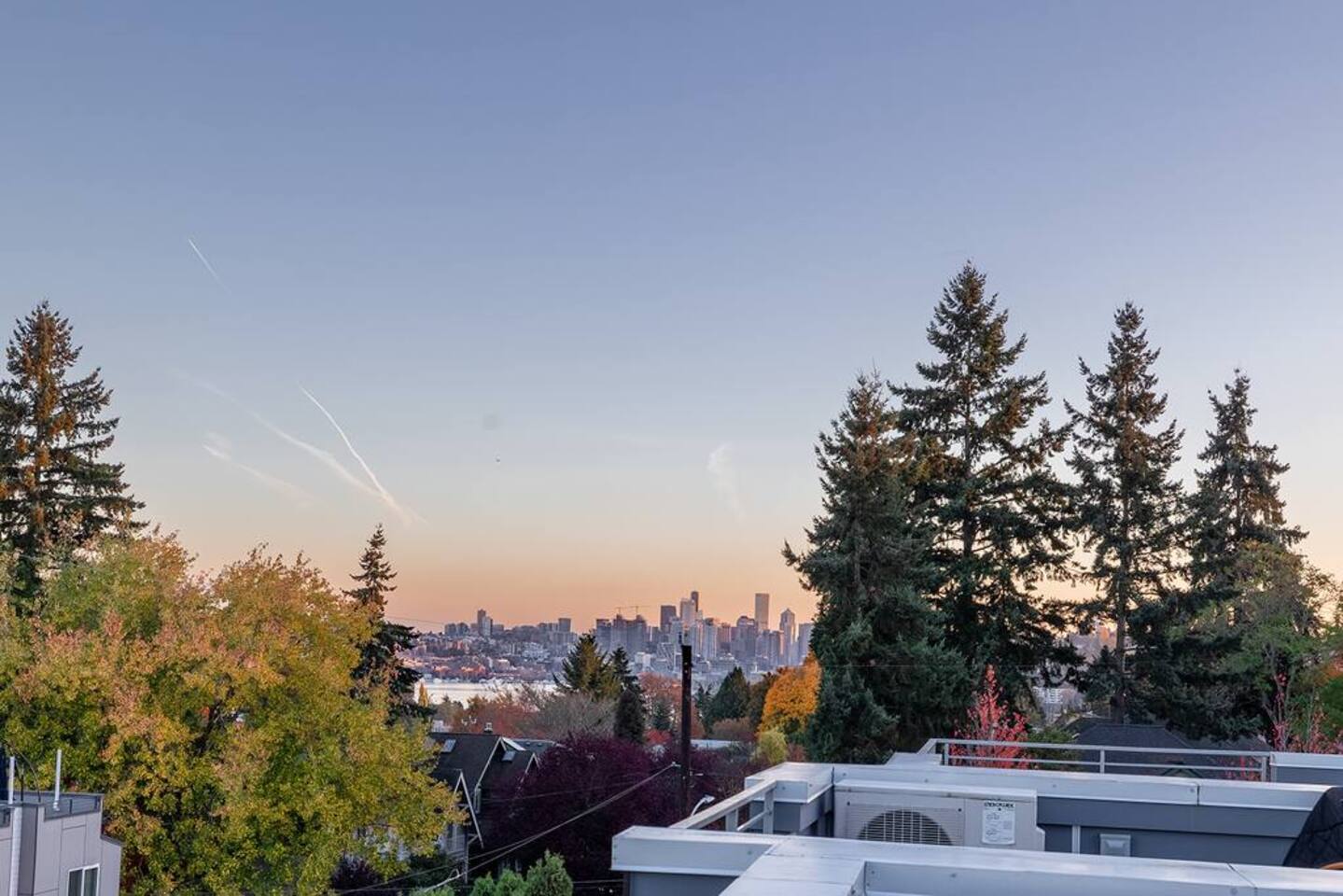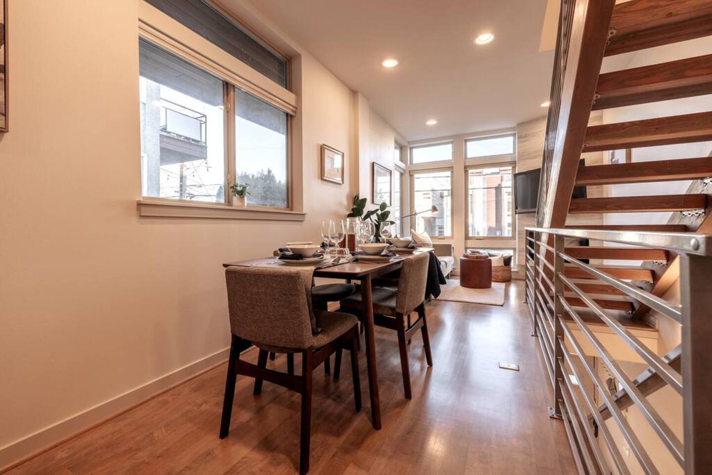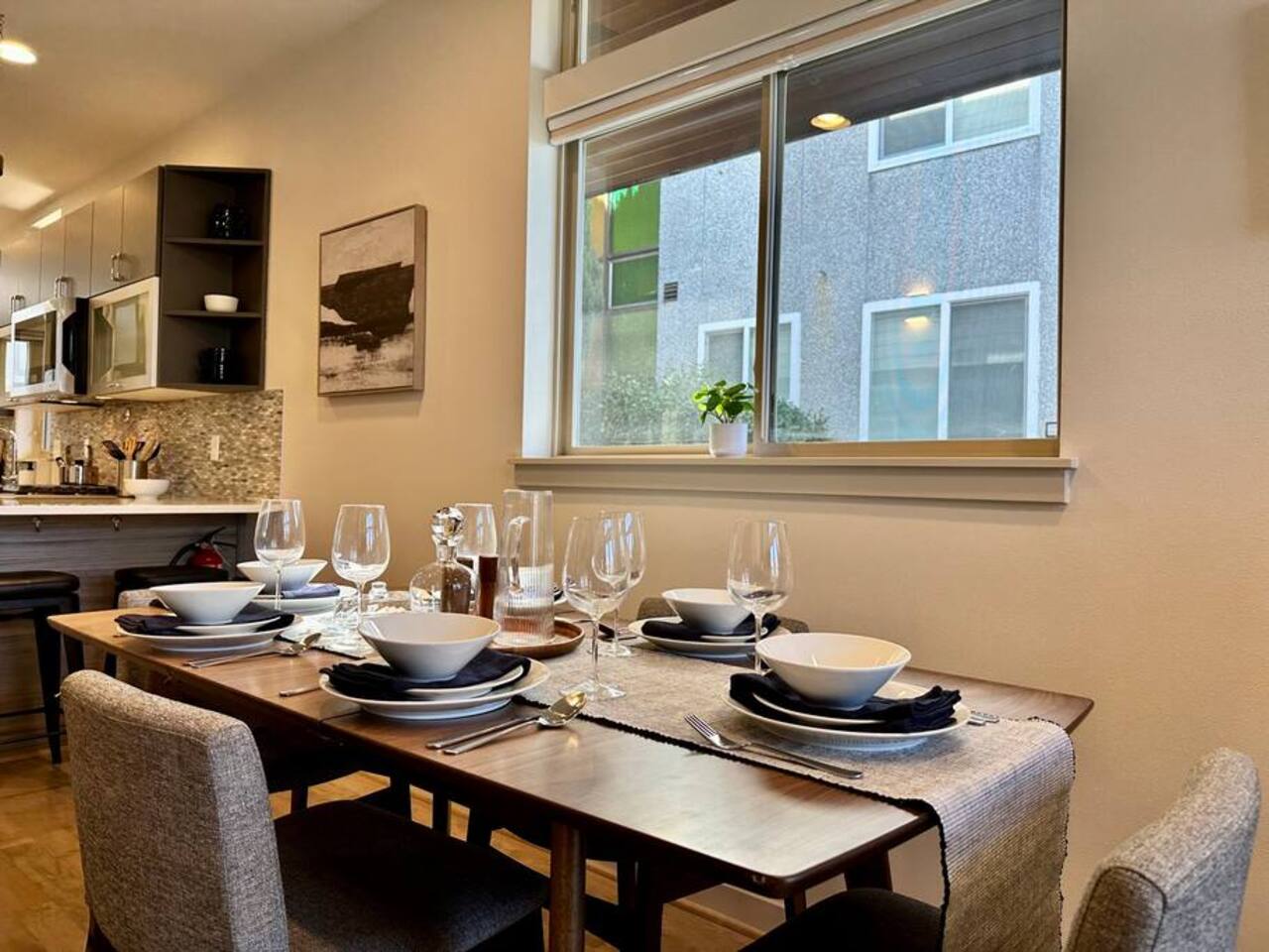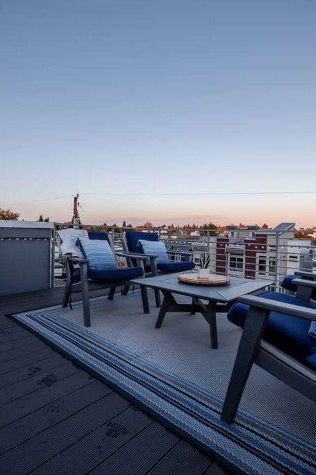 Welcome to Lake Union Lookout, a light-filled, front-corner townhome perched where Seattle’s most beloved neighborhoods meet. This stylish 3-bedroom, multi-level home blends modern design with a warm Northwest feel, offering three inviting bedrooms, beautifully finished bathrooms, and a seamless flow between indoor and outdoor living spaces. Designed across four graceful levels, the home invites you to slow down, settle in, and experience the city the way locals do—through food, light, and long walks that turn into evenings out. Comfortably accommodating up to 6 guests, Lake Union Lookout celebrates Seattle’s unique charm and offers a serene yet deeply connected place to stay. The Entry Level The entry level includes the private entrance, attached garage, and laundry room, offering a calm and welcoming arrival. There’s space to set your bags down, tuck away shoes and coats, and gently transition out of the day before moving upstairs into the heart of the home. The Living Level Up one level, the home opens wide. Sunlight pours through walls of windows, warming gleaming hardwood floors and framing the neighborhood beyond. The gourmet kitchen is designed for real cooking and slow evenings in, featuring quartz countertops, modern cabinetry, a generous undermount sink, and a 5-burner gas range that invites shared meals and lingering conversations. The dining table seats six, with additional seating at the kitchen bar. The living room—anchored by an electric fireplace and large Smart TV—becomes the perfect place to unwind with a glass of wine or a favorite film. A sculptural floating staircase connects each level, adding a striking architectural rhythm throughout the home. The Bedrooms (Third Floor) All bedrooms are located together on the top floor, creating a quiet and private retreat. Grey Haven Suite – A serene primary suite with floor-to-ceiling windows and blackout curtains, a plush king Casper mattress, walk-in closet, and a spa-like en-suite bathroom featuring an indulgent two-piece walk-in shower (sleeps 2) Spring in Seattle Room – A cozy room with a plush queen Casper mattress, located just off a full bathroom with a shower (sleeps 2) In the Clouds Room – Features two twin trundle beds, plus a desk and chair for work or study—ideal for kids, friends, or additional guests (sleeps 2) The Rooftop (Fourth Floor) The private rooftop deck is the crown jewel of the home—and it truly lives up to the photos. From this elevated perch, take in sweeping views of the Seattle skyline and Lake Union, with boats gliding below and the city glowing as day turns to night. Grill dinner as the sun sets, gather around the outdoor dining table for six, or sink into comfortable seating with your morning coffee or evening glass of wine. Open sky, shifting light, and that unmistakable Seattle magic—it’s unforgettable. This is where time slows down. Parking: While garage parking is available, it is compact and may be difficult to maneuver in. For larger vehicles, we recommend street parking. "Lake Union Lookout" is equipped with all the comforts you need, including air conditioning, plush beds, Wi-Fi, a smart TV with HBOGO, a washer/dryer, and a dishwasher. Whether you're visiting for business or leisure, our home is the perfect base for your Seattle adventures.