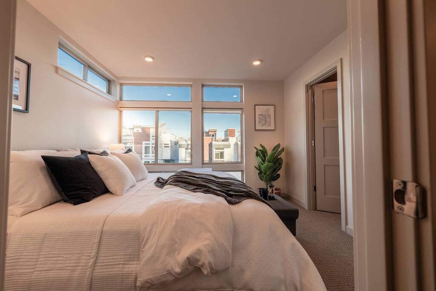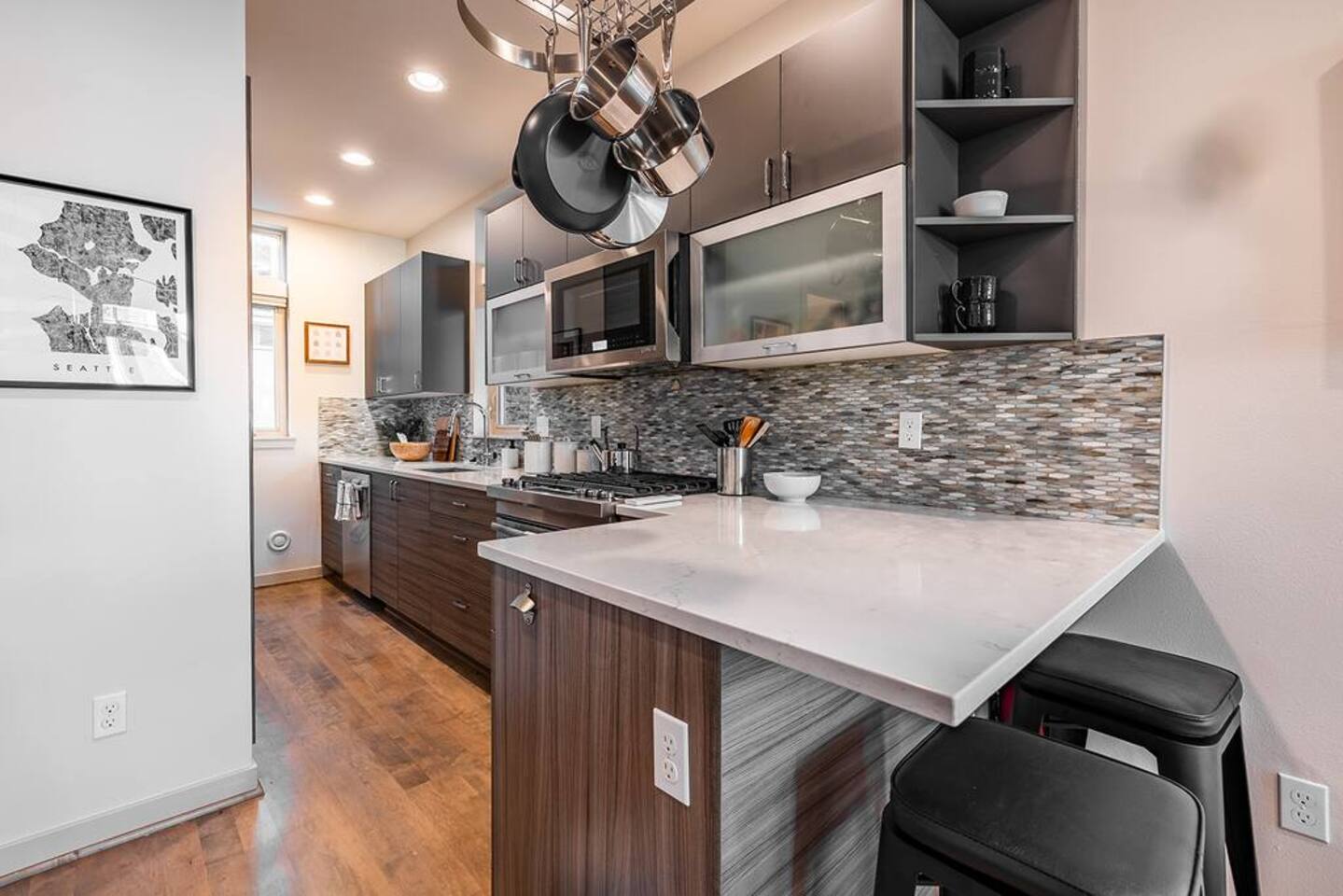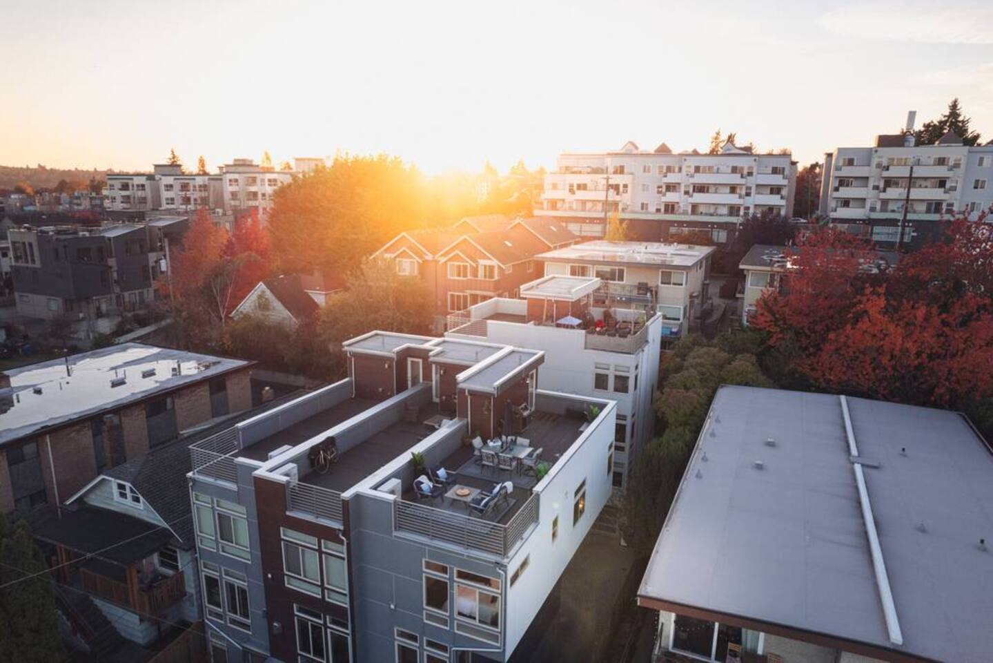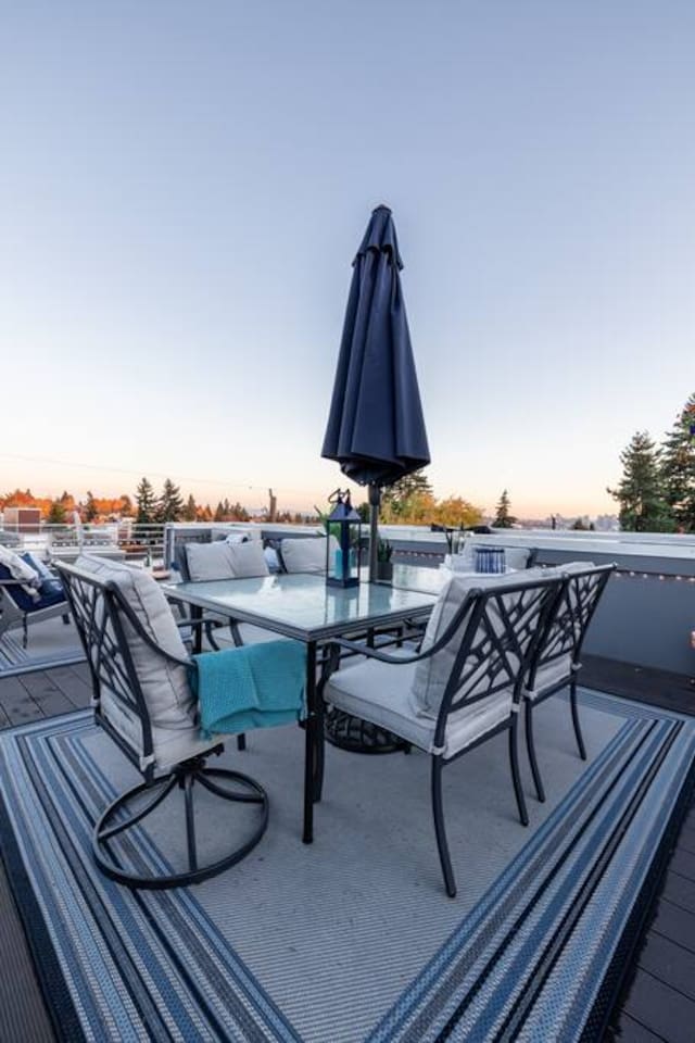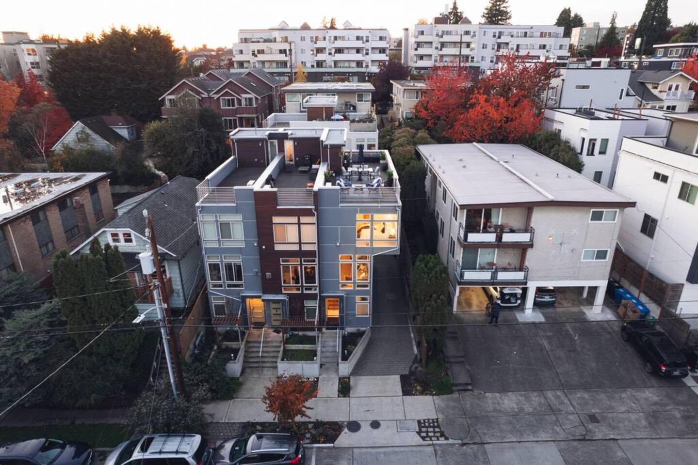 Welcome to Lake Union Lookout, a light-filled, front-corner townhome perched where Seattle’s most beloved neighborhoods meet. This stylish 3-bedroom, multi-level home blends modern design with a warm Northwest feel, offering three inviting bedrooms, beautifully finished bathrooms, and a seamless flow between indoor and outdoor living spaces. Designed across four graceful levels, the home invites you to slow down, settle in, and experience the city the way locals do—through food, light, and long walks that turn into evenings out. Comfortably accommodating up to 6 guests, Lake Union Lookout celebrates Seattle’s unique charm and offers a serene yet deeply connected place to stay. The Entry Level The entry level includes the private entrance, attached garage, and laundry room, offering a calm and welcoming arrival. There’s space to set your bags down, tuck away shoes and coats, and gently transition out of the day before moving upstairs into the heart of the home. The Living Level Up one level, the home opens wide. Sunlight pours through walls of windows, warming gleaming hardwood floors and framing the neighborhood beyond. The gourmet kitchen is designed for real cooking and slow evenings in, featuring quartz countertops, modern cabinetry, a generous undermount sink, and a 5-burner gas range that invites shared meals and lingering conversations. The dining table seats six, with additional seating at the kitchen bar. The living room—anchored by an electric fireplace and large Smart TV—becomes the perfect place to unwind with a glass of wine or a favorite film. A sculptural floating staircase connects each level, adding a striking architectural rhythm throughout the home. The Bedrooms (Third Floor) All bedrooms are located together on the top floor, creating a quiet and private retreat. Grey Haven Suite – A serene primary suite with floor-to-ceiling windows and blackout curtains, a plush king Casper mattress, walk-in closet, and a spa-like en-suite bathroom featuring an indulgent two-piece walk-in shower (sleeps 2) Spring in Seattle Room – A cozy room with a plush queen Casper mattress, located just off a full bathroom with a shower (sleeps 2) In the Clouds Room – Features two twin trundle beds, plus a desk and chair for work or study—ideal for kids, friends, or additional guests (sleeps 2) The Rooftop (Fourth Floor) The private rooftop deck is the crown jewel of the home—and it truly lives up to the photos. From this elevated perch, take in sweeping views of the Seattle skyline and Lake Union, with boats gliding below and the city glowing as day turns to night. Grill dinner as the sun sets, gather around the outdoor dining table for six, or sink into comfortable seating with your morning coffee or evening glass of wine. Open sky, shifting light, and that unmistakable Seattle magic—it’s unforgettable. This is where time slows down. Parking: While garage parking is available, it is compact and may be difficult to maneuver in. For larger vehicles, we recommend street parking. "Lake Union Lookout" is equipped with all the comforts you need, including air conditioning, plush beds, Wi-Fi, a smart TV with HBOGO, a washer/dryer, and a dishwasher. Whether you're visiting for business or leisure, our home is the perfect base for your Seattle adventures.
