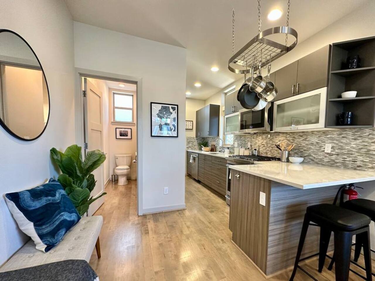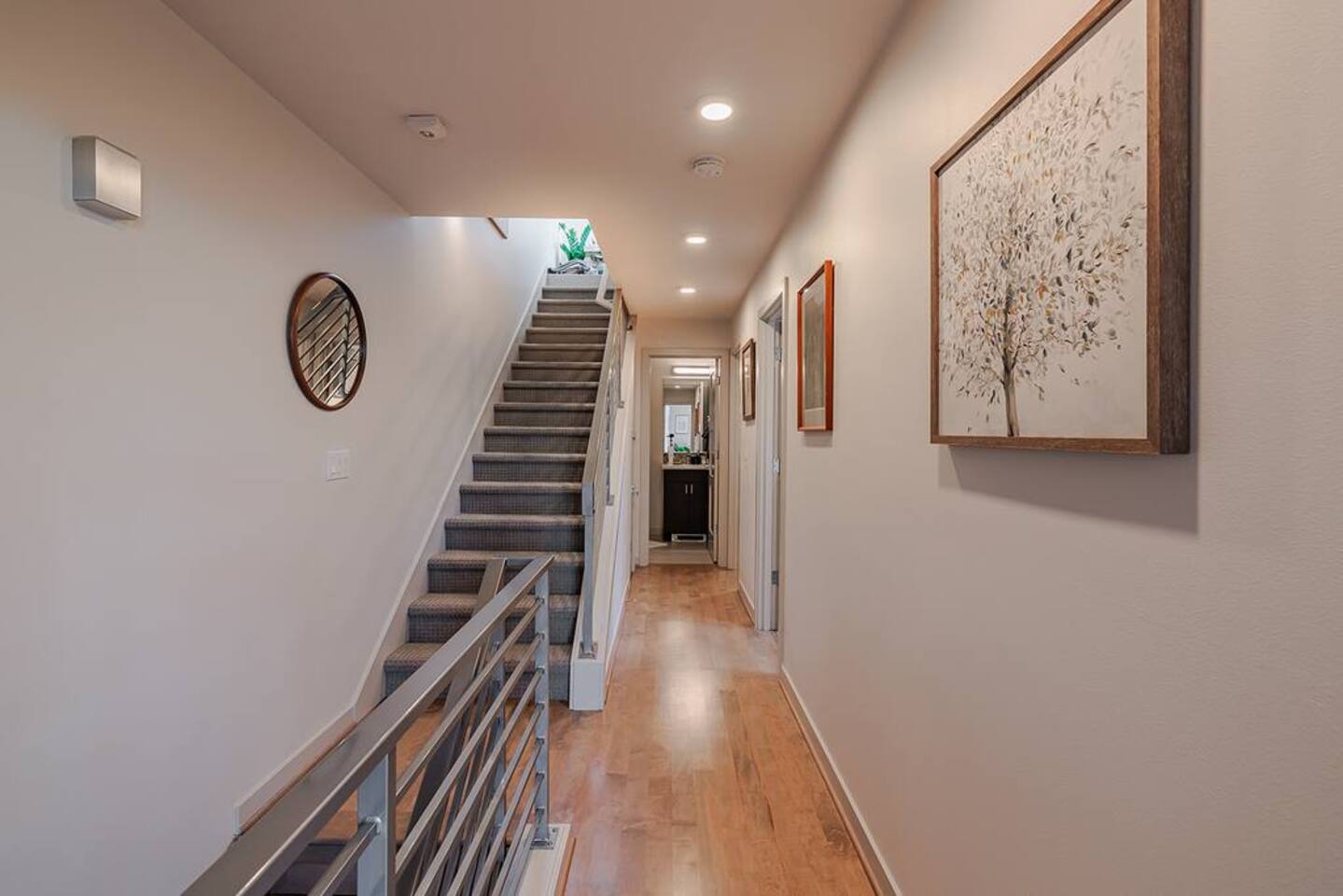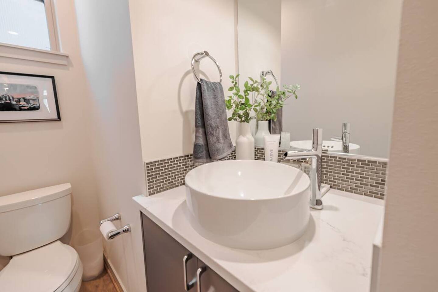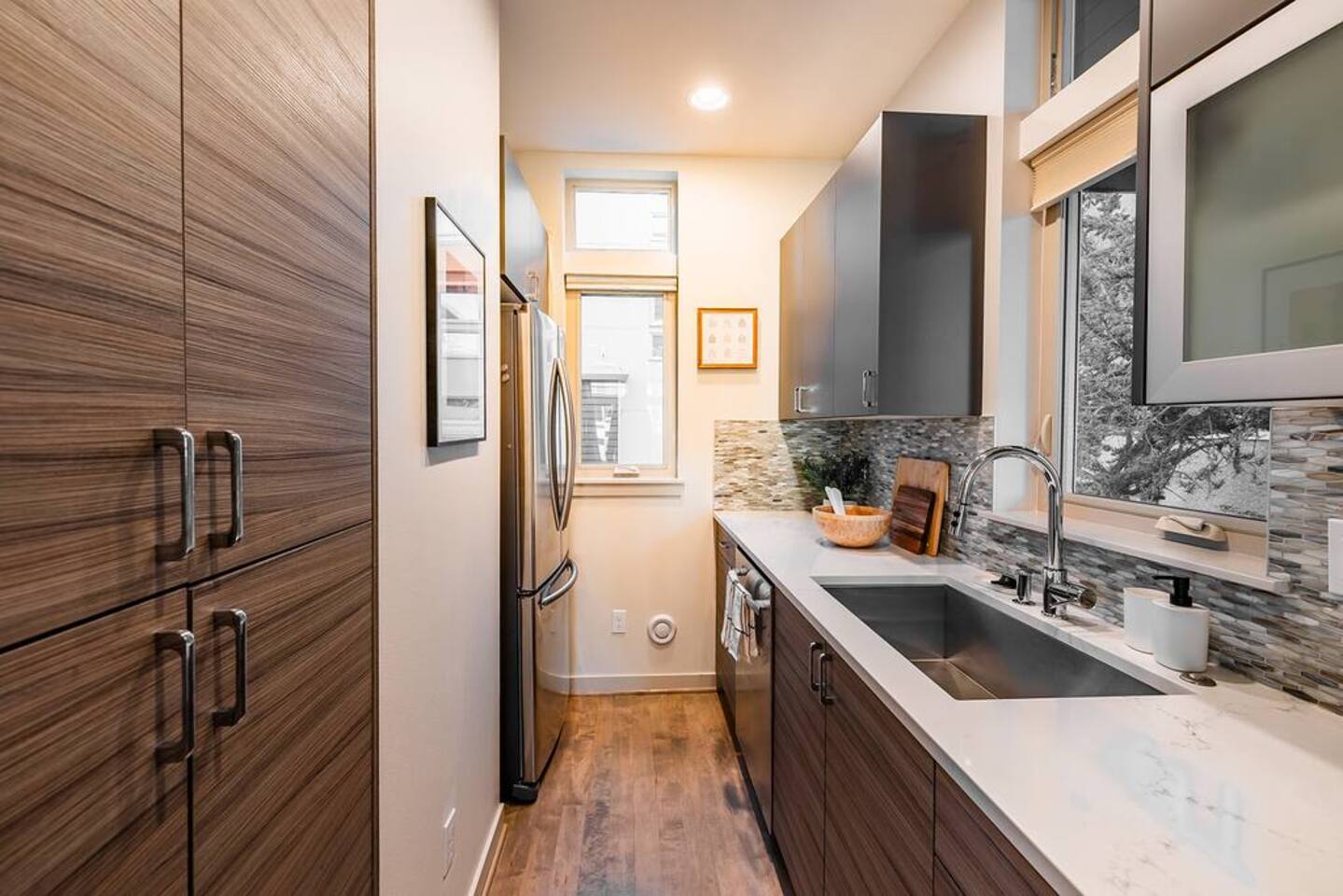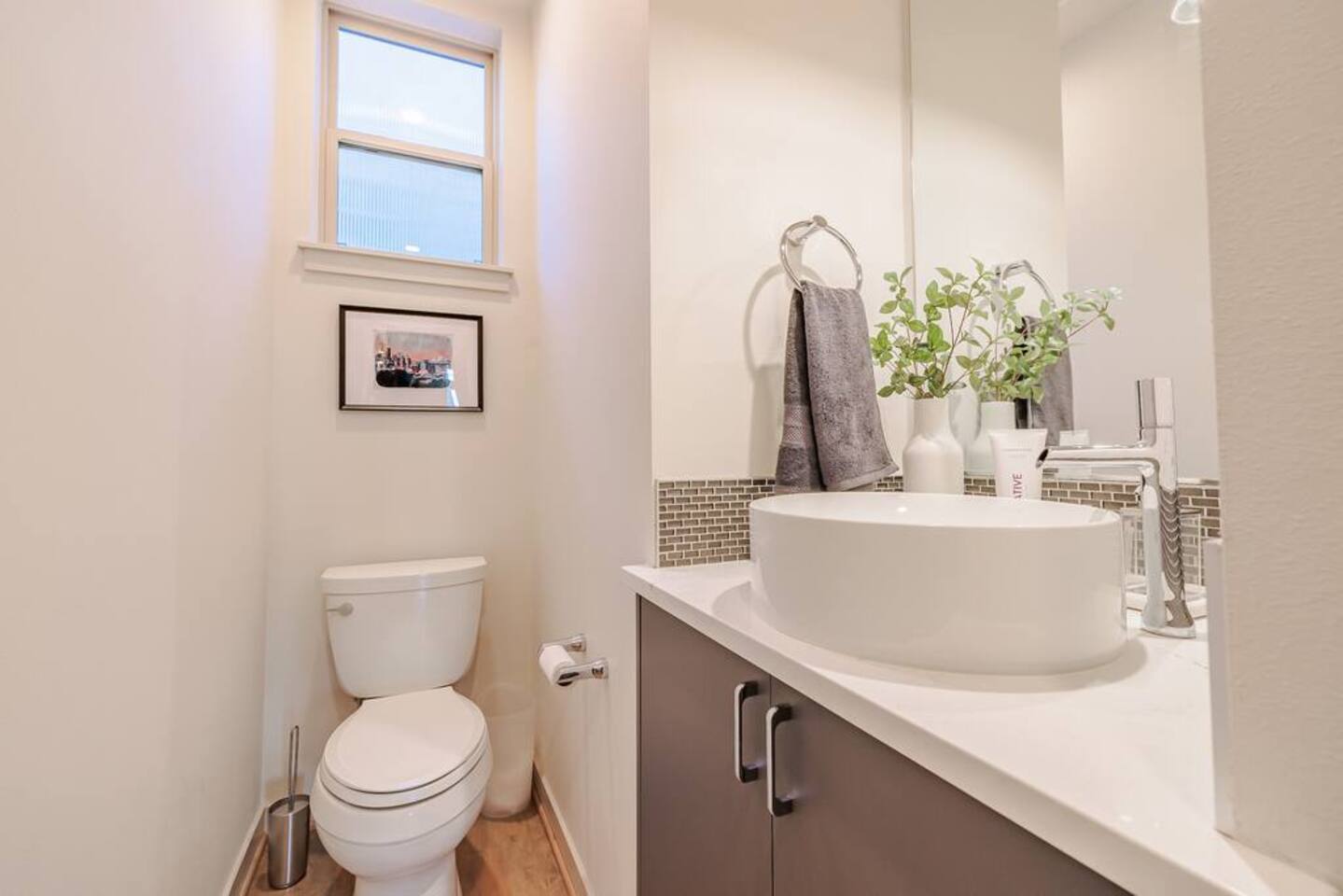 Welcome to Lake Union Lookout, a light-filled, front-corner townhome perched where Seattle’s most beloved neighborhoods meet. This stylish 3-bedroom, multi-level home blends modern design with a warm Northwest feel, offering three inviting bedrooms, beautifully finished bathrooms, and a seamless flow between indoor and outdoor living spaces. Designed across four graceful levels, the home invites you to slow down, settle in, and experience the city the way locals do—through food, light, and long walks that turn into evenings out. Comfortably accommodating up to 6 guests, Lake Union Lookout celebrates Seattle’s unique charm and offers a serene yet deeply connected place to stay. The Entry Level The entry level includes the private entrance, attached garage, and laundry room, offering a calm and welcoming arrival. There’s space to set your bags down, tuck away shoes and coats, and gently transition out of the day before moving upstairs into the heart of the home. The Living Level Up one level, the home opens wide. Sunlight pours through walls of windows, warming gleaming hardwood floors and framing the neighborhood beyond. The gourmet kitchen is designed for real cooking and slow evenings in, featuring quartz countertops, modern cabinetry, a generous undermount sink, and a 5-burner gas range that invites shared meals and lingering conversations. The dining table seats six, with additional seating at the kitchen bar. The living room—anchored by an electric fireplace and large Smart TV—becomes the perfect place to unwind with a glass of wine or a favorite film. A sculptural floating staircase connects each level, adding a striking architectural rhythm throughout the home. The Bedrooms (Third Floor) All bedrooms are located together on the top floor, creating a quiet and private retreat. Grey Haven Suite – A serene primary suite with floor-to-ceiling windows and blackout curtains, a plush king Casper mattress, walk-in closet, and a spa-like en-suite bathroom featuring an indulgent two-piece walk-in shower (sleeps 2) Spring in Seattle Room – A cozy room with a plush queen Casper mattress, located just off a full bathroom with a shower (sleeps 2) In the Clouds Room – Features two twin trundle beds, plus a desk and chair for work or study—ideal for kids, friends, or additional guests (sleeps 2) The Rooftop (Fourth Floor) The private rooftop deck is the crown jewel of the home—and it truly lives up to the photos. From this elevated perch, take in sweeping views of the Seattle skyline and Lake Union, with boats gliding below and the city glowing as day turns to night. Grill dinner as the sun sets, gather around the outdoor dining table for six, or sink into comfortable seating with your morning coffee or evening glass of wine. Open sky, shifting light, and that unmistakable Seattle magic—it’s unforgettable. This is where time slows down. Parking: While garage parking is available, it is compact and may be difficult to maneuver in. For larger vehicles, we recommend street parking. "Lake Union Lookout" is equipped with all the comforts you need, including air conditioning, plush beds, Wi-Fi, a smart TV with HBOGO, a washer/dryer, and a dishwasher. Whether you're visiting for business or leisure, our home is the perfect base for your Seattle adventures.