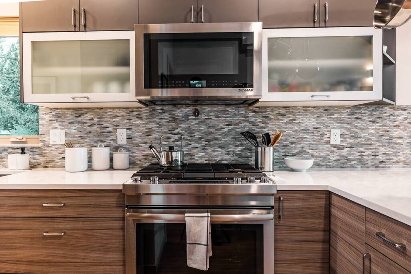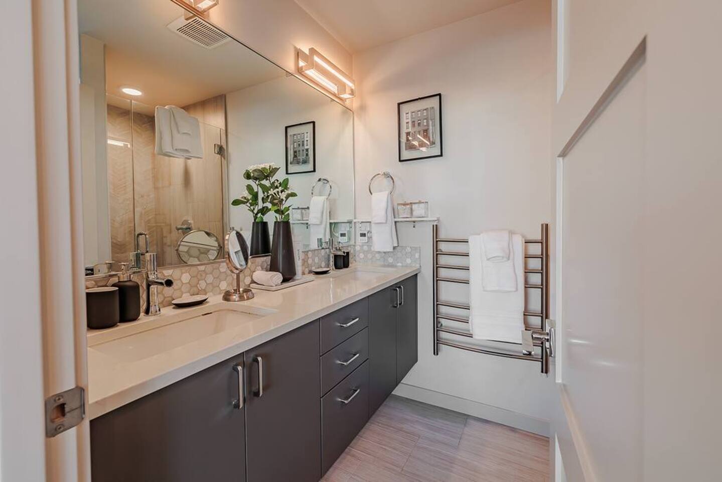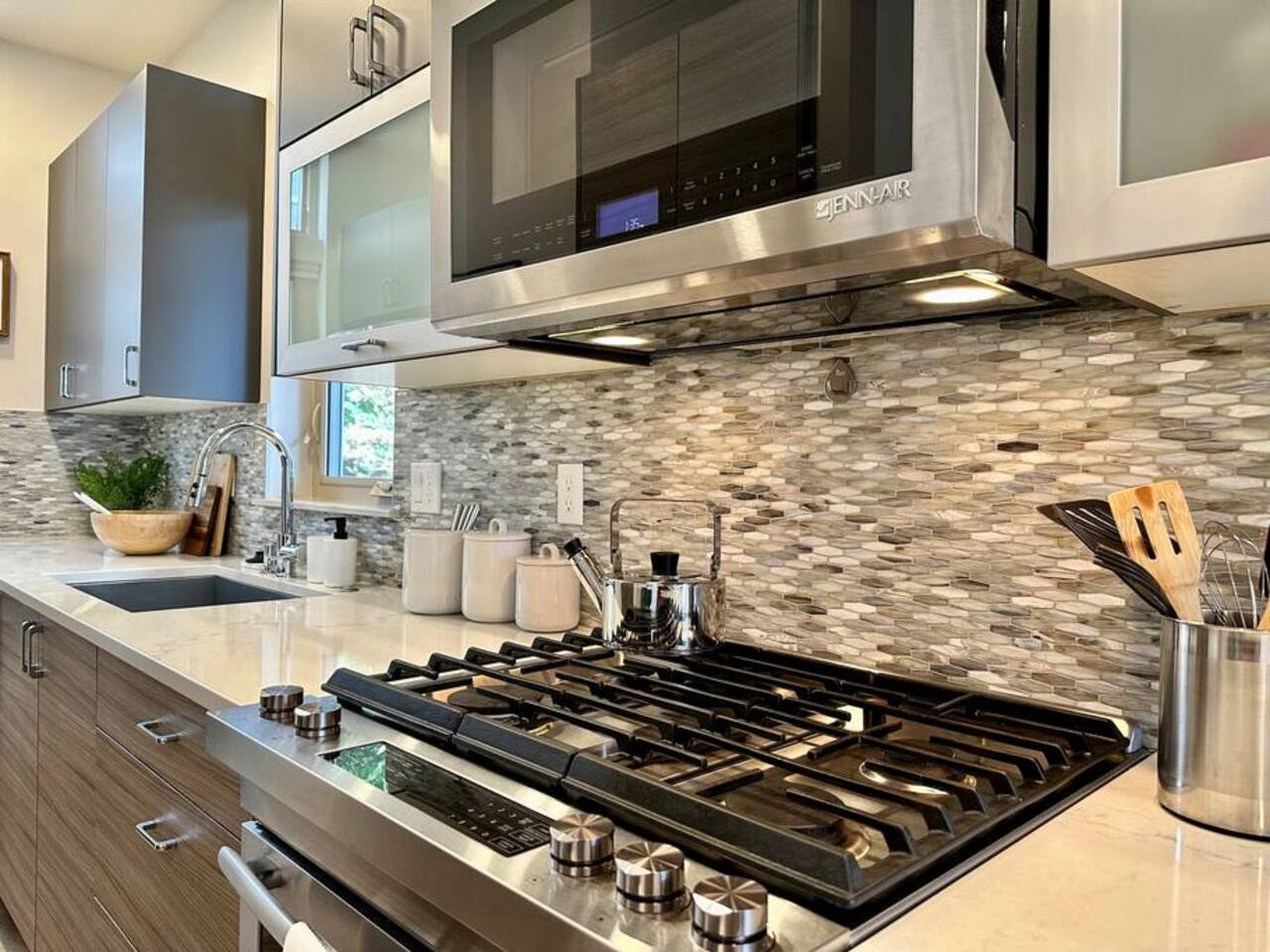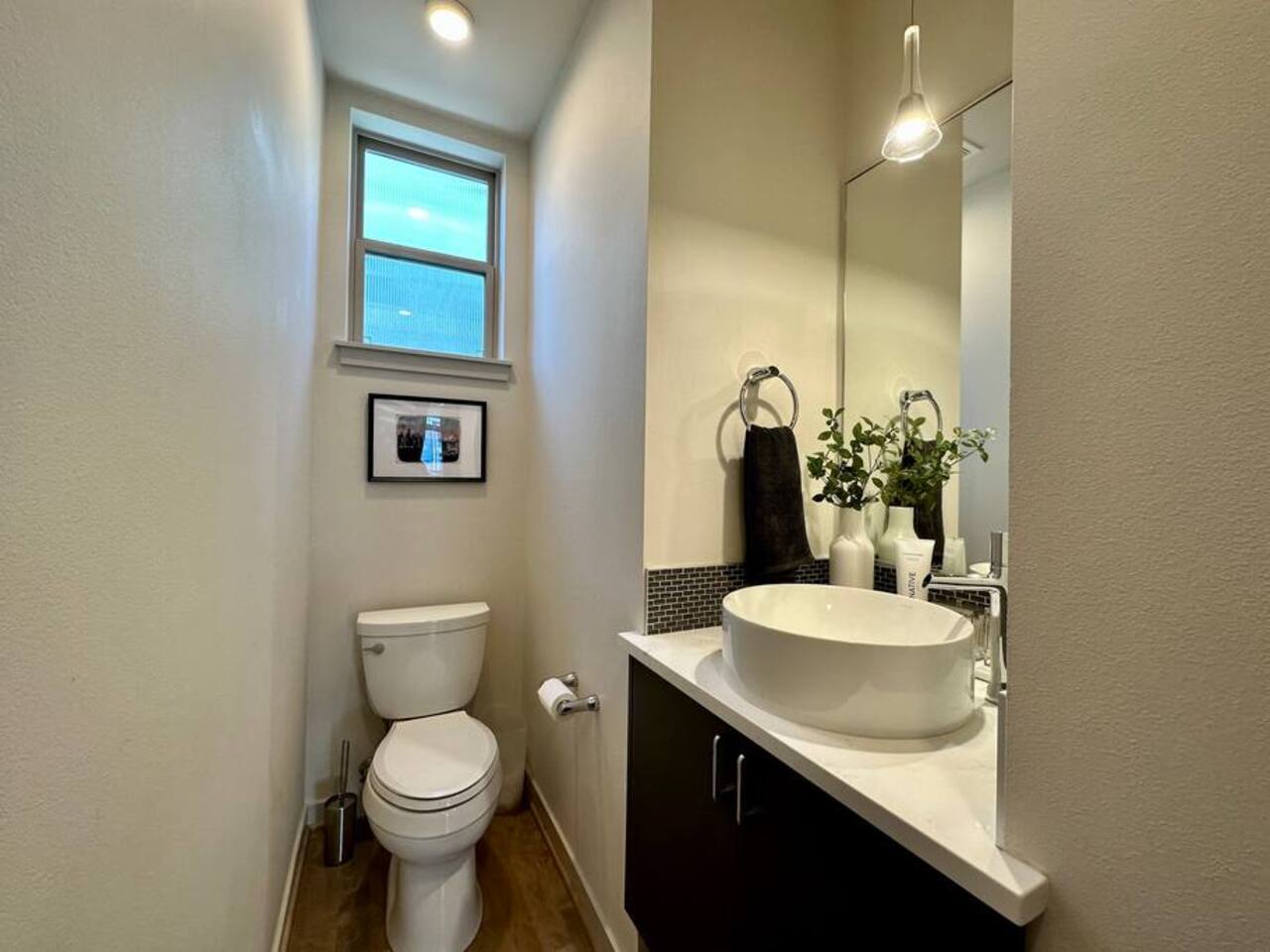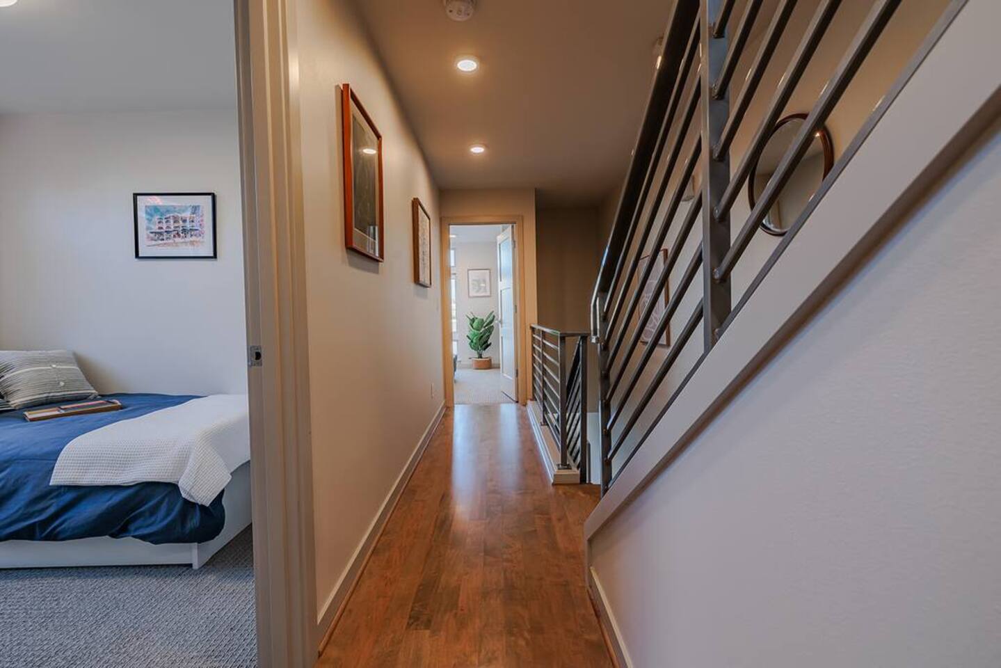 Welcome to Lake Union Lookout, a light-filled, front-corner townhome perched where Seattle’s most beloved neighborhoods meet. This stylish 3-bedroom, multi-level home blends modern design with a warm Northwest feel, offering three inviting bedrooms, beautifully finished bathrooms, and a seamless flow between indoor and outdoor living spaces. Designed across four graceful levels, the home invites you to slow down, settle in, and experience the city the way locals do—through food, light, and long walks that turn into evenings out. Comfortably accommodating up to 6 guests, Lake Union Lookout celebrates Seattle’s unique charm and offers a serene yet deeply connected place to stay. The Entry Level The entry level includes the private entrance, attached garage, and laundry room, offering a calm and welcoming arrival. There’s space to set your bags down, tuck away shoes and coats, and gently transition out of the day before moving upstairs into the heart of the home. The Living Level Up one level, the home opens wide. Sunlight pours through walls of windows, warming gleaming hardwood floors and framing the neighborhood beyond. The gourmet kitchen is designed for real cooking and slow evenings in, featuring quartz countertops, modern cabinetry, a generous undermount sink, and a 5-burner gas range that invites shared meals and lingering conversations. The dining table seats six, with additional seating at the kitchen bar. The living room—anchored by an electric fireplace and large Smart TV—becomes the perfect place to unwind with a glass of wine or a favorite film. A sculptural floating staircase connects each level, adding a striking architectural rhythm throughout the home. The Bedrooms (Third Floor) All bedrooms are located together on the top floor, creating a quiet and private retreat. Grey Haven Suite – A serene primary suite with floor-to-ceiling windows and blackout curtains, a plush king Casper mattress, walk-in closet, and a spa-like en-suite bathroom featuring an indulgent two-piece walk-in shower (sleeps 2) Spring in Seattle Room – A cozy room with a plush queen Casper mattress, located just off a full bathroom with a shower (sleeps 2) In the Clouds Room – Features two twin trundle beds, plus a desk and chair for work or study—ideal for kids, friends, or additional guests (sleeps 2) The Rooftop (Fourth Floor) The private rooftop deck is the crown jewel of the home—and it truly lives up to the photos. From this elevated perch, take in sweeping views of the Seattle skyline and Lake Union, with boats gliding below and the city glowing as day turns to night. Grill dinner as the sun sets, gather around the outdoor dining table for six, or sink into comfortable seating with your morning coffee or evening glass of wine. Open sky, shifting light, and that unmistakable Seattle magic—it’s unforgettable. This is where time slows down. Parking: While garage parking is available, it is compact and may be difficult to maneuver in. For larger vehicles, we recommend street parking. "Lake Union Lookout" is equipped with all the comforts you need, including air conditioning, plush beds, Wi-Fi, a smart TV with HBOGO, a washer/dryer, and a dishwasher. Whether you're visiting for business or leisure, our home is the perfect base for your Seattle adventures.