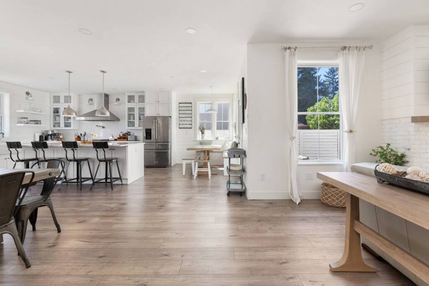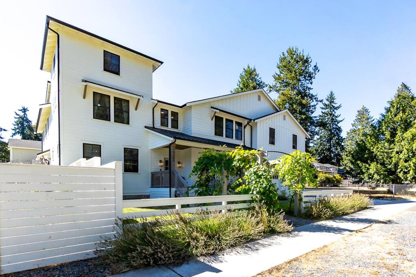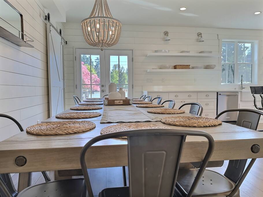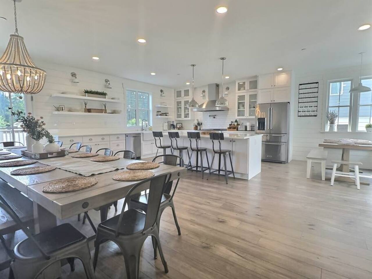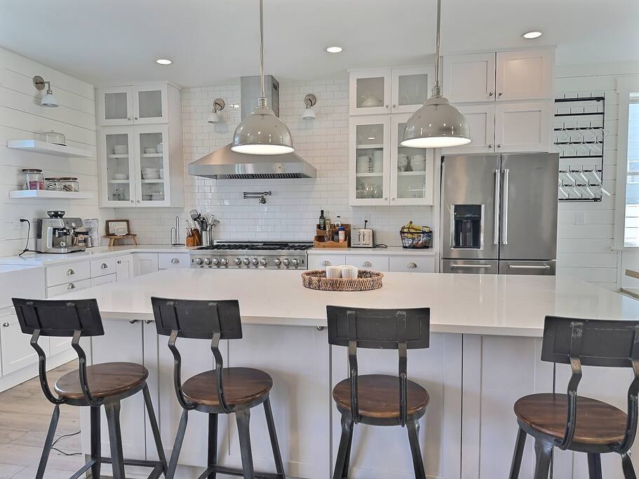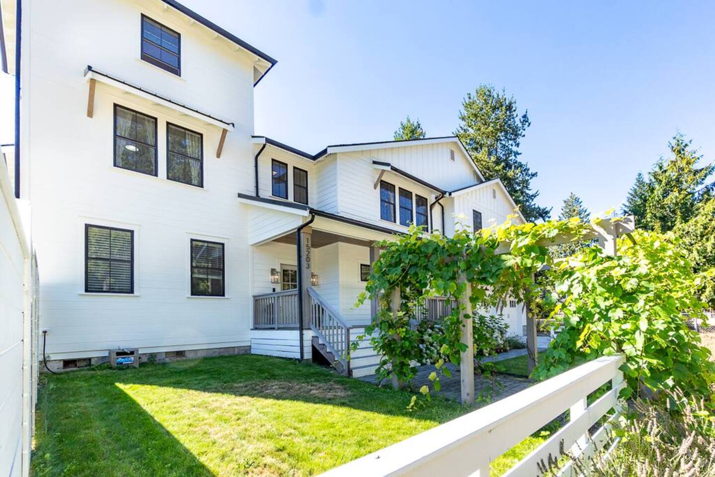 Welcome to Serenity at Shoreline, your invitation to gather, restore, and experience a slower rhythm—surrounded by beauty, comfort, and just the right touch of grace. Tucked in a quiet Shoreline neighborhood just north of Seattle, this modern white farmhouse was thoughtfully designed to hold both joy and stillness in equal measure. Driftwood tones, vintage touches, and sunlit spaces come together to create a stay that feels warm, grounded, and unforgettable. From shared meals around the oversized dining table to slow mornings with coffee in the garden, every inch of this home encourages you to soften, settle in, and stay awhile. Just blocks from the Shoreline light rail station, guests enjoy effortless access to both Seattle and Lynnwood, as well as quick connections to I-5 for convenient regional travel. At the heart of the home, you’ll find an open-concept living space with plush seating and a double-sided fireplace, connecting seamlessly to the chef’s kitchen. Outfitted with a six-burner range, island seating, and all the small appliances you might need, the kitchen is perfectly equipped for slow breakfasts, shared dinners, and everything in between. Just around the corner, a cozy theater room invites you to unwind with a favorite film or settle in for a movie night after a day of adventure. All common living spaces are located on the main floor—with the exception of the laundry room, which is tucked away for convenience. The home features five thoughtfully designed bedrooms and a third-floor crow’s nest den—each with its own character and charm. Whether you're hosting a large gathering, retreating with a smaller group, or simply seeking a quiet escape, there’s space to rest and reconnect in every corner. ________________________________________ Where You’ll Sleep 🌿 The Wisteria Suite — Main Floor, King Bed + En-Suite Bath This restful suite feels like a deep exhale—layered in muted light, gentle textures, and a quiet kind of elegance. Located on the main floor, it features a plush king bed, a private en-suite bathroom, and calming views of the cascading wisteria vines just beyond its windows. 🌲 The Driftwood Suite — Upper Floor, King Bed + En-Suite Bath A sanctuary in the sky. With vaulted shiplap ceilings and sun-drenched interiors, this upstairs suite offers both space and stillness. The five-piece en-suite bath features a decadent pedestal soaking tub, and a large TV makes it the perfect space for unwinding in comfort. 🕊 The Shoreline Room — Upper Floor, Queen Bed + Shared Bath Tranquil, simple, and serene, this queen bedroom is located near the shared hallway bath. Designed with early morning light and soft-toned stillness in mind, it’s a peaceful escape tucked just across from the Driftwood Suite. 🌙 The Sea Star Bunkroom — Upper Floor, 2 Twin-Over-Twin Bunks + Shared Bath Playful and cozy, this light-hearted space features two twin-over-twin bunk beds and plenty of charm. It’s ideal for cousins, siblings, or anyone young at heart. 🌸 The Hydrangea Room — Upper Floor, Queen Bed + En-Suite Bath Tucked toward the back of the home, this light-filled queen suite offers privacy and calm. It includes a private en-suite bathroom and a soft, muted palette. A TV makes it a perfect place to retreat and unwind. 🪶 The Lookout — Third Floor, Vaulted Den Perched at the very top of the house, this crow’s nest den is wrapped in treetop views. With vaulted ceilings and natural light, it’s perfect for journaling, quiet work, or creative solitude—your personal perch above it all. ________________________________________ Step outside into a fully fenced backyard where nature wraps around you like a gentle whisper. Twinkling lights twist above the outdoor dining space, hydrangeas bloom in blues and blush, and a soft green lawn invites you to slip off your shoes and feel the earth beneath your feet The home is equipped with everything you need for a seamless and comfortable stay: high-speed Wi-Fi, smart TVs, a full laundry room, luxurious linens, plush towels, and a curated starter supply of soaps and household essentials. Every space—every corner—has been arranged with care, wrapped in warmth, and built for ease. Reminiscent of classic townhomes and side-by-side estates, Serenity at Shoreline shares one wall with a neighboring private residence. Each home is fully self-contained, with its own private entrance, living quarters, yard, and parking—ensuring your stay feels peaceful, independent, and uninterrupted “Come as you are. Leave a little lighter.” This isn’t just a place to stay—it’s a gentle invitation to slow down, breathe deeper, and find a softer way of being, right here in the quiet heart of Shoreline.
