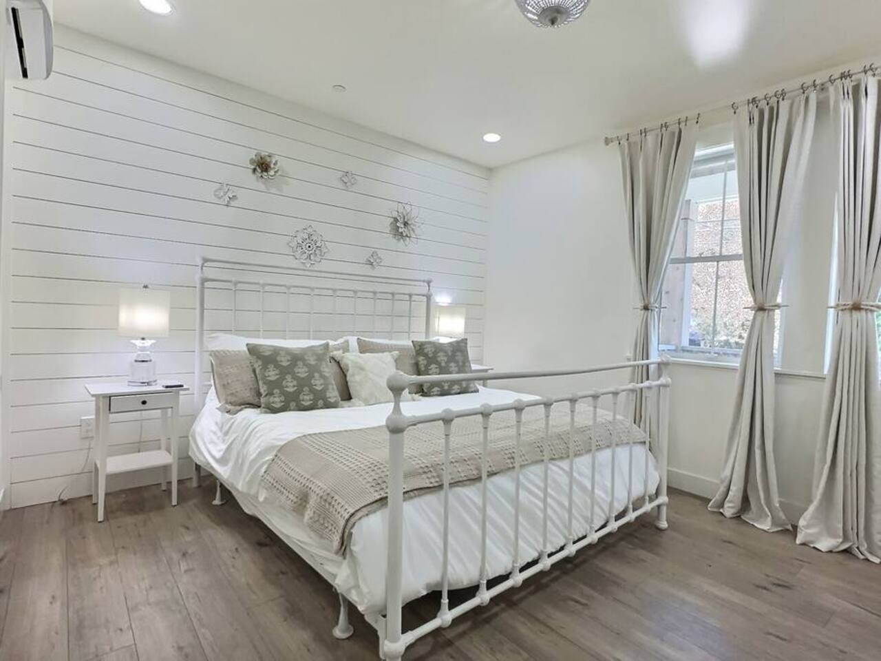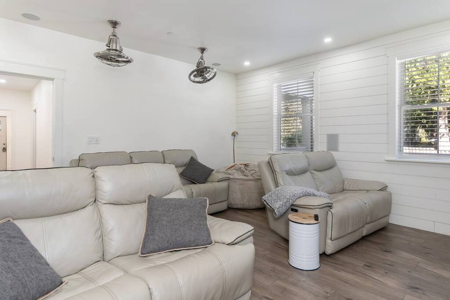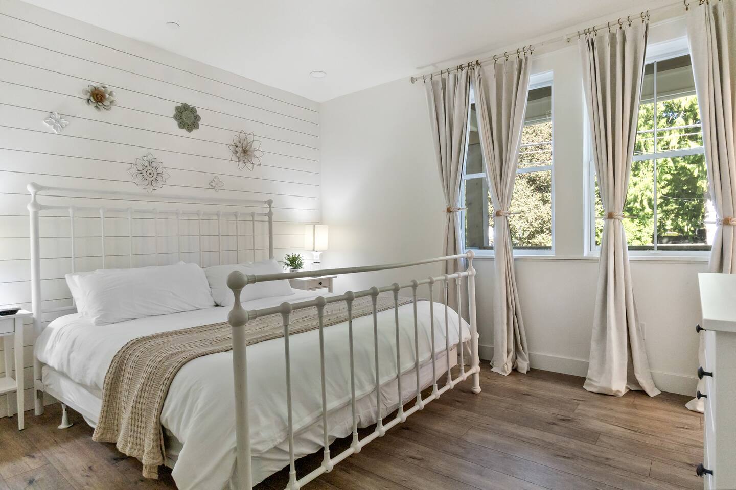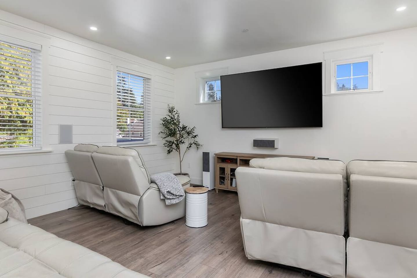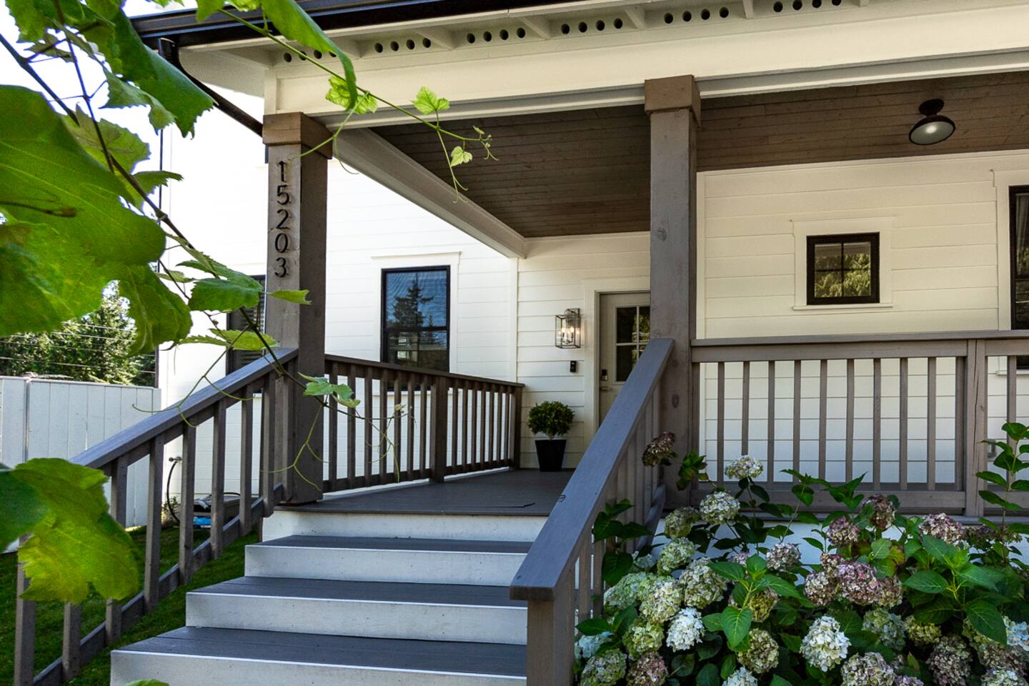 Welcome to Serenity at Shoreline, your invitation to gather, restore, and experience a slower rhythm—surrounded by beauty, comfort, and just the right touch of grace. Tucked in a quiet Shoreline neighborhood just north of Seattle, this modern white farmhouse was thoughtfully designed to hold both joy and stillness in equal measure. Driftwood tones, vintage touches, and sunlit spaces come together to create a stay that feels warm, grounded, and unforgettable. From shared meals around the oversized dining table to slow mornings with coffee in the garden, every inch of this home encourages you to soften, settle in, and stay awhile. Just blocks from the Shoreline light rail station, guests enjoy effortless access to both Seattle and Lynnwood, as well as quick connections to I-5 for convenient regional travel. At the heart of the home, you’ll find an open-concept living space with plush seating and a double-sided fireplace, connecting seamlessly to the chef’s kitchen. Outfitted with a six-burner range, island seating, and all the small appliances you might need, the kitchen is perfectly equipped for slow breakfasts, shared dinners, and everything in between. Just around the corner, a cozy theater room invites you to unwind with a favorite film or settle in for a movie night after a day of adventure. All common living spaces are located on the main floor—with the exception of the laundry room, which is tucked away for convenience. The home features five thoughtfully designed bedrooms and a third-floor crow’s nest den—each with its own character and charm. Whether you're hosting a large gathering, retreating with a smaller group, or simply seeking a quiet escape, there’s space to rest and reconnect in every corner. ________________________________________ Where You’ll Sleep 🌿 The Wisteria Suite — Main Floor, King Bed + En-Suite Bath This restful suite feels like a deep exhale—layered in muted light, gentle textures, and a quiet kind of elegance. Located on the main floor, it features a plush king bed, a private en-suite bathroom, and calming views of the cascading wisteria vines just beyond its windows. 🌲 The Driftwood Suite — Upper Floor, King Bed + En-Suite Bath A sanctuary in the sky. With vaulted shiplap ceilings and sun-drenched interiors, this upstairs suite offers both space and stillness. The five-piece en-suite bath features a decadent pedestal soaking tub, and a large TV makes it the perfect space for unwinding in comfort. 🕊 The Shoreline Room — Upper Floor, Queen Bed + Shared Bath Tranquil, simple, and serene, this queen bedroom is located near the shared hallway bath. Designed with early morning light and soft-toned stillness in mind, it’s a peaceful escape tucked just across from the Driftwood Suite. 🌙 The Sea Star Bunkroom — Upper Floor, 2 Twin-Over-Twin Bunks + Shared Bath Playful and cozy, this light-hearted space features two twin-over-twin bunk beds and plenty of charm. It’s ideal for cousins, siblings, or anyone young at heart. 🌸 The Hydrangea Room — Upper Floor, Queen Bed + En-Suite Bath Tucked toward the back of the home, this light-filled queen suite offers privacy and calm. It includes a private en-suite bathroom and a soft, muted palette. A TV makes it a perfect place to retreat and unwind. 🪶 The Lookout — Third Floor, Vaulted Den Perched at the very top of the house, this crow’s nest den is wrapped in treetop views. With vaulted ceilings and natural light, it’s perfect for journaling, quiet work, or creative solitude—your personal perch above it all. ________________________________________ Step outside into a fully fenced backyard where nature wraps around you like a gentle whisper. Twinkling lights twist above the outdoor dining space, hydrangeas bloom in blues and blush, and a soft green lawn invites you to slip off your shoes and feel the earth beneath your feet The home is equipped with everything you need for a seamless and comfortable stay: high-speed Wi-Fi, smart TVs, a full laundry room, luxurious linens, plush towels, and a curated starter supply of soaps and household essentials. Every space—every corner—has been arranged with care, wrapped in warmth, and built for ease. Reminiscent of classic townhomes and side-by-side estates, Serenity at Shoreline shares one wall with a neighboring private residence. Each home is fully self-contained, with its own private entrance, living quarters, yard, and parking—ensuring your stay feels peaceful, independent, and uninterrupted “Come as you are. Leave a little lighter.” This isn’t just a place to stay—it’s a gentle invitation to slow down, breathe deeper, and find a softer way of being, right here in the quiet heart of Shoreline.