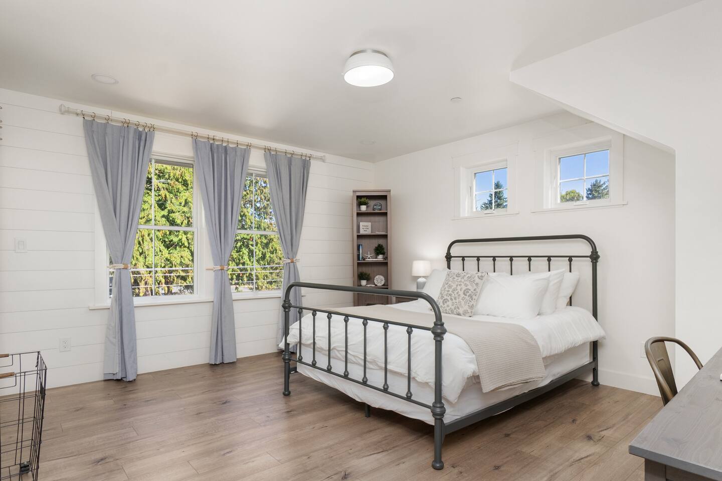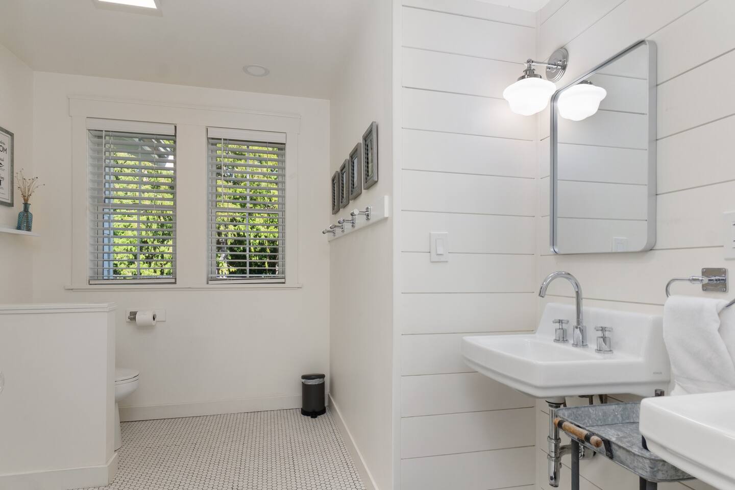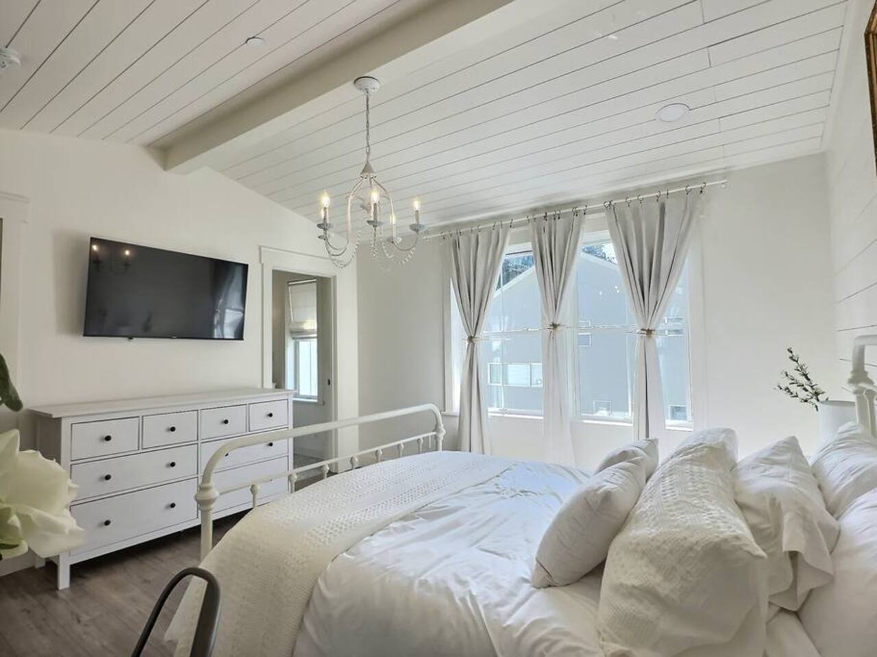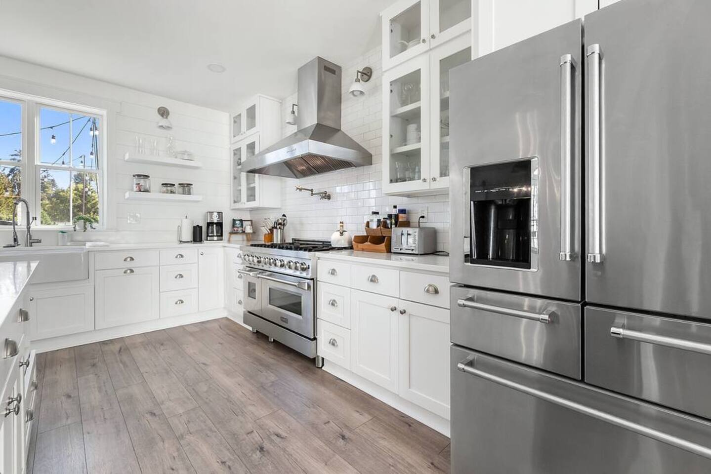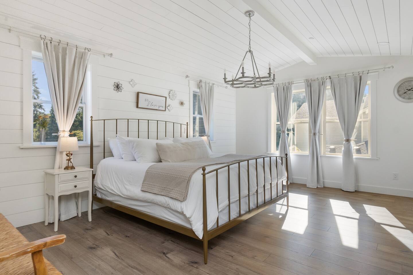 Welcome to Serenity at Shoreline, your invitation to gather, restore, and experience a slower rhythm—surrounded by beauty, comfort, and just the right touch of grace. Tucked in a quiet Shoreline neighborhood just north of Seattle, this modern white farmhouse was thoughtfully designed to hold both joy and stillness in equal measure. Driftwood tones, vintage touches, and sunlit spaces come together to create a stay that feels warm, grounded, and unforgettable. From shared meals around the oversized dining table to slow mornings with coffee in the garden, every inch of this home encourages you to soften, settle in, and stay awhile. Just blocks from the Shoreline light rail station, guests enjoy effortless access to both Seattle and Lynnwood, as well as quick connections to I-5 for convenient regional travel. At the heart of the home, you’ll find an open-concept living space with plush seating and a double-sided fireplace, connecting seamlessly to the chef’s kitchen. Outfitted with a six-burner range, island seating, and all the small appliances you might need, the kitchen is perfectly equipped for slow breakfasts, shared dinners, and everything in between. Just around the corner, a cozy theater room invites you to unwind with a favorite film or settle in for a movie night after a day of adventure. All common living spaces are located on the main floor—with the exception of the laundry room, which is tucked away for convenience. The home features five thoughtfully designed bedrooms and a third-floor crow’s nest den—each with its own character and charm. Whether you're hosting a large gathering, retreating with a smaller group, or simply seeking a quiet escape, there’s space to rest and reconnect in every corner. ________________________________________ Where You’ll Sleep 🌿 The Wisteria Suite — Main Floor, King Bed + En-Suite Bath This restful suite feels like a deep exhale—layered in muted light, gentle textures, and a quiet kind of elegance. Located on the main floor, it features a plush king bed, a private en-suite bathroom, and calming views of the cascading wisteria vines just beyond its windows. 🌲 The Driftwood Suite — Upper Floor, King Bed + En-Suite Bath A sanctuary in the sky. With vaulted shiplap ceilings and sun-drenched interiors, this upstairs suite offers both space and stillness. The five-piece en-suite bath features a decadent pedestal soaking tub, and a large TV makes it the perfect space for unwinding in comfort. 🕊 The Shoreline Room — Upper Floor, Queen Bed + Shared Bath Tranquil, simple, and serene, this queen bedroom is located near the shared hallway bath. Designed with early morning light and soft-toned stillness in mind, it’s a peaceful escape tucked just across from the Driftwood Suite. 🌙 The Sea Star Bunkroom — Upper Floor, 2 Twin-Over-Twin Bunks + Shared Bath Playful and cozy, this light-hearted space features two twin-over-twin bunk beds and plenty of charm. It’s ideal for cousins, siblings, or anyone young at heart. 🌸 The Hydrangea Room — Upper Floor, Queen Bed + En-Suite Bath Tucked toward the back of the home, this light-filled queen suite offers privacy and calm. It includes a private en-suite bathroom and a soft, muted palette. A TV makes it a perfect place to retreat and unwind. 🪶 The Lookout — Third Floor, Vaulted Den Perched at the very top of the house, this crow’s nest den is wrapped in treetop views. With vaulted ceilings and natural light, it’s perfect for journaling, quiet work, or creative solitude—your personal perch above it all. ________________________________________ Step outside into a fully fenced backyard where nature wraps around you like a gentle whisper. Twinkling lights twist above the outdoor dining space, hydrangeas bloom in blues and blush, and a soft green lawn invites you to slip off your shoes and feel the earth beneath your feet The home is equipped with everything you need for a seamless and comfortable stay: high-speed Wi-Fi, smart TVs, a full laundry room, luxurious linens, plush towels, and a curated starter supply of soaps and household essentials. Every space—every corner—has been arranged with care, wrapped in warmth, and built for ease. Reminiscent of classic townhomes and side-by-side estates, Serenity at Shoreline shares one wall with a neighboring private residence. Each home is fully self-contained, with its own private entrance, living quarters, yard, and parking—ensuring your stay feels peaceful, independent, and uninterrupted “Come as you are. Leave a little lighter.” This isn’t just a place to stay—it’s a gentle invitation to slow down, breathe deeper, and find a softer way of being, right here in the quiet heart of Shoreline.