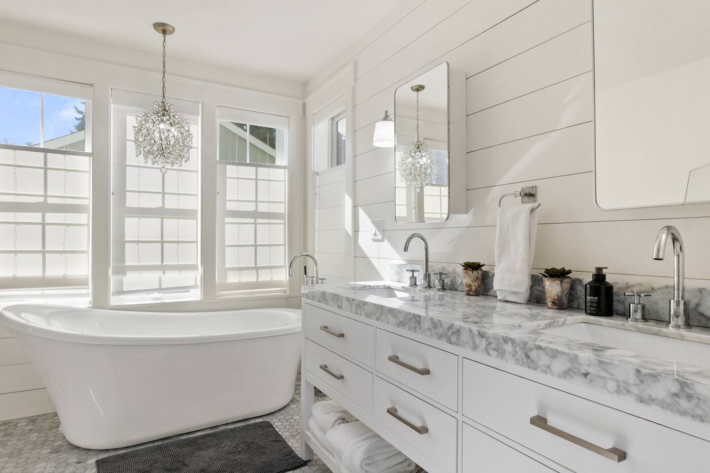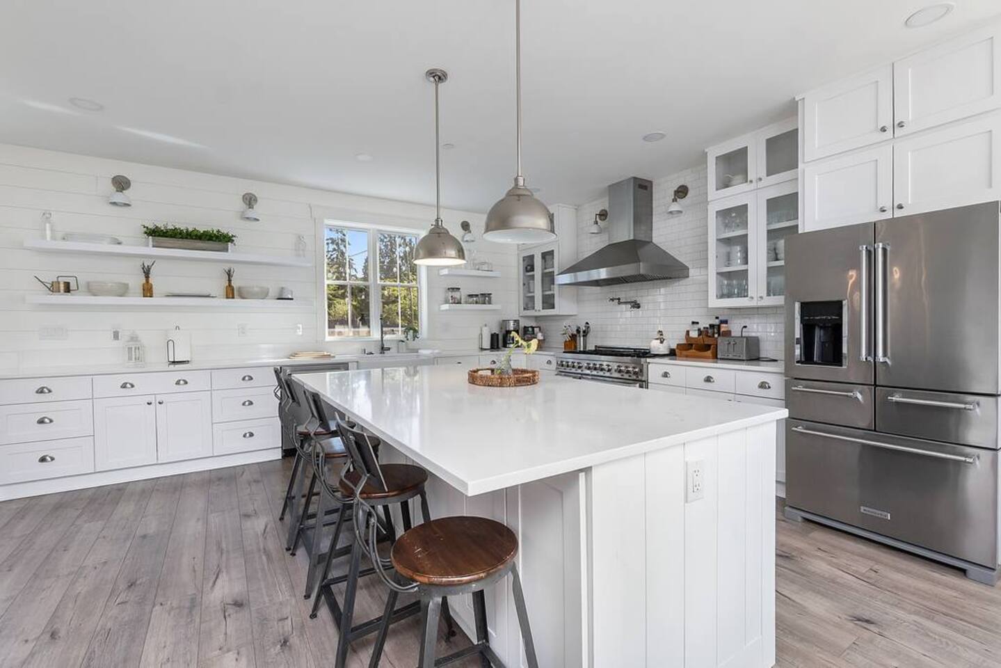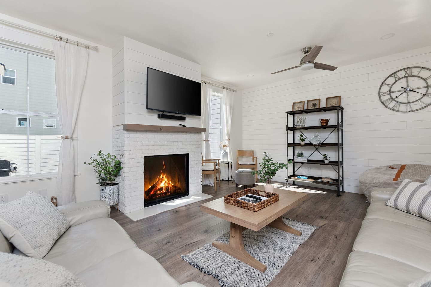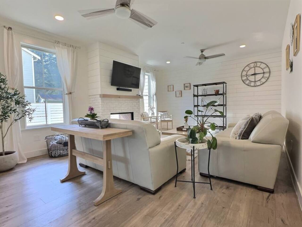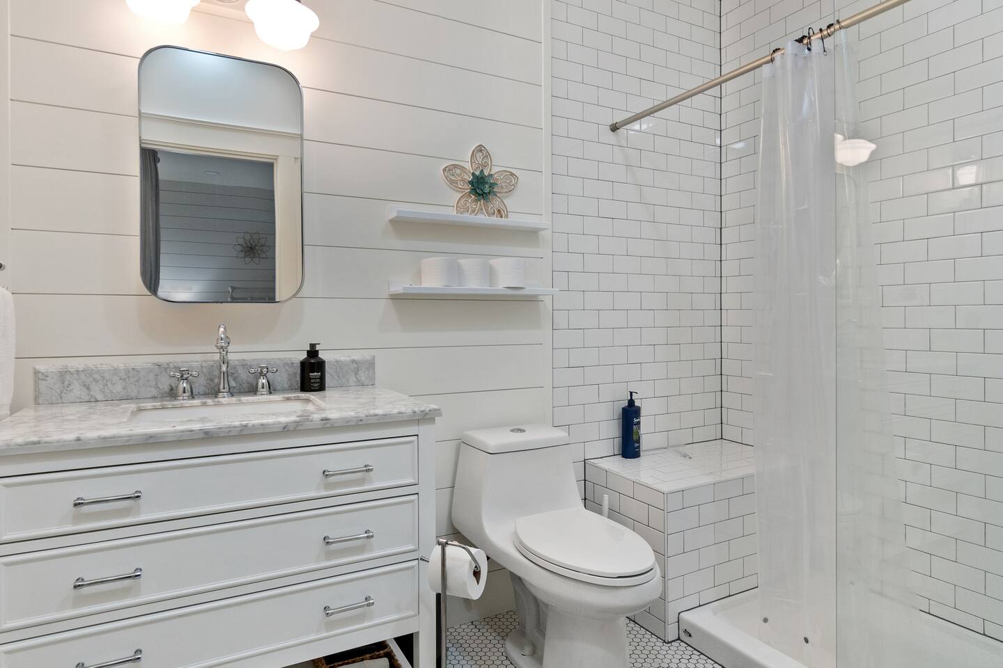 Welcome to Serenity at Shoreline, your invitation to gather, restore, and experience a slower rhythm—surrounded by beauty, comfort, and just the right touch of grace. Tucked in a quiet Shoreline neighborhood just north of Seattle, this modern white farmhouse was thoughtfully designed to hold both joy and stillness in equal measure. Driftwood tones, vintage touches, and sunlit spaces come together to create a stay that feels warm, grounded, and unforgettable. From shared meals around the oversized dining table to slow mornings with coffee in the garden, every inch of this home encourages you to soften, settle in, and stay awhile. Just blocks from the Shoreline light rail station, guests enjoy effortless access to both Seattle and Lynnwood, as well as quick connections to I-5 for convenient regional travel. At the heart of the home, you’ll find an open-concept living space with plush seating and a double-sided fireplace, connecting seamlessly to the chef’s kitchen. Outfitted with a six-burner range, island seating, and all the small appliances you might need, the kitchen is perfectly equipped for slow breakfasts, shared dinners, and everything in between. Just around the corner, a cozy theater room invites you to unwind with a favorite film or settle in for a movie night after a day of adventure. All common living spaces are located on the main floor—with the exception of the laundry room, which is tucked away for convenience. The home features five thoughtfully designed bedrooms and a third-floor crow’s nest den—each with its own character and charm. Whether you're hosting a large gathering, retreating with a smaller group, or simply seeking a quiet escape, there’s space to rest and reconnect in every corner. ________________________________________ Where You’ll Sleep 🌿 The Wisteria Suite — Main Floor, King Bed + En-Suite Bath This restful suite feels like a deep exhale—layered in muted light, gentle textures, and a quiet kind of elegance. Located on the main floor, it features a plush king bed, a private en-suite bathroom, and calming views of the cascading wisteria vines just beyond its windows. 🌲 The Driftwood Suite — Upper Floor, King Bed + En-Suite Bath A sanctuary in the sky. With vaulted shiplap ceilings and sun-drenched interiors, this upstairs suite offers both space and stillness. The five-piece en-suite bath features a decadent pedestal soaking tub, and a large TV makes it the perfect space for unwinding in comfort. 🕊 The Shoreline Room — Upper Floor, Queen Bed + Shared Bath Tranquil, simple, and serene, this queen bedroom is located near the shared hallway bath. Designed with early morning light and soft-toned stillness in mind, it’s a peaceful escape tucked just across from the Driftwood Suite. 🌙 The Sea Star Bunkroom — Upper Floor, 2 Twin-Over-Twin Bunks + Shared Bath Playful and cozy, this light-hearted space features two twin-over-twin bunk beds and plenty of charm. It’s ideal for cousins, siblings, or anyone young at heart. 🌸 The Hydrangea Room — Upper Floor, Queen Bed + En-Suite Bath Tucked toward the back of the home, this light-filled queen suite offers privacy and calm. It includes a private en-suite bathroom and a soft, muted palette. A TV makes it a perfect place to retreat and unwind. 🪶 The Lookout — Third Floor, Vaulted Den Perched at the very top of the house, this crow’s nest den is wrapped in treetop views. With vaulted ceilings and natural light, it’s perfect for journaling, quiet work, or creative solitude—your personal perch above it all. ________________________________________ Step outside into a fully fenced backyard where nature wraps around you like a gentle whisper. Twinkling lights twist above the outdoor dining space, hydrangeas bloom in blues and blush, and a soft green lawn invites you to slip off your shoes and feel the earth beneath your feet The home is equipped with everything you need for a seamless and comfortable stay: high-speed Wi-Fi, smart TVs, a full laundry room, luxurious linens, plush towels, and a curated starter supply of soaps and household essentials. Every space—every corner—has been arranged with care, wrapped in warmth, and built for ease. Reminiscent of classic townhomes and side-by-side estates, Serenity at Shoreline shares one wall with a neighboring private residence. Each home is fully self-contained, with its own private entrance, living quarters, yard, and parking—ensuring your stay feels peaceful, independent, and uninterrupted “Come as you are. Leave a little lighter.” This isn’t just a place to stay—it’s a gentle invitation to slow down, breathe deeper, and find a softer way of being, right here in the quiet heart of Shoreline.