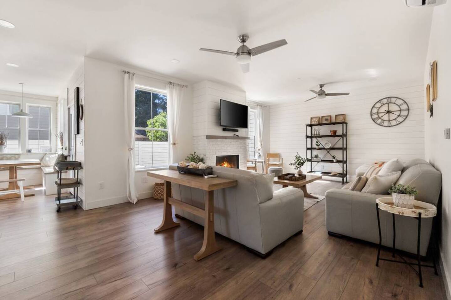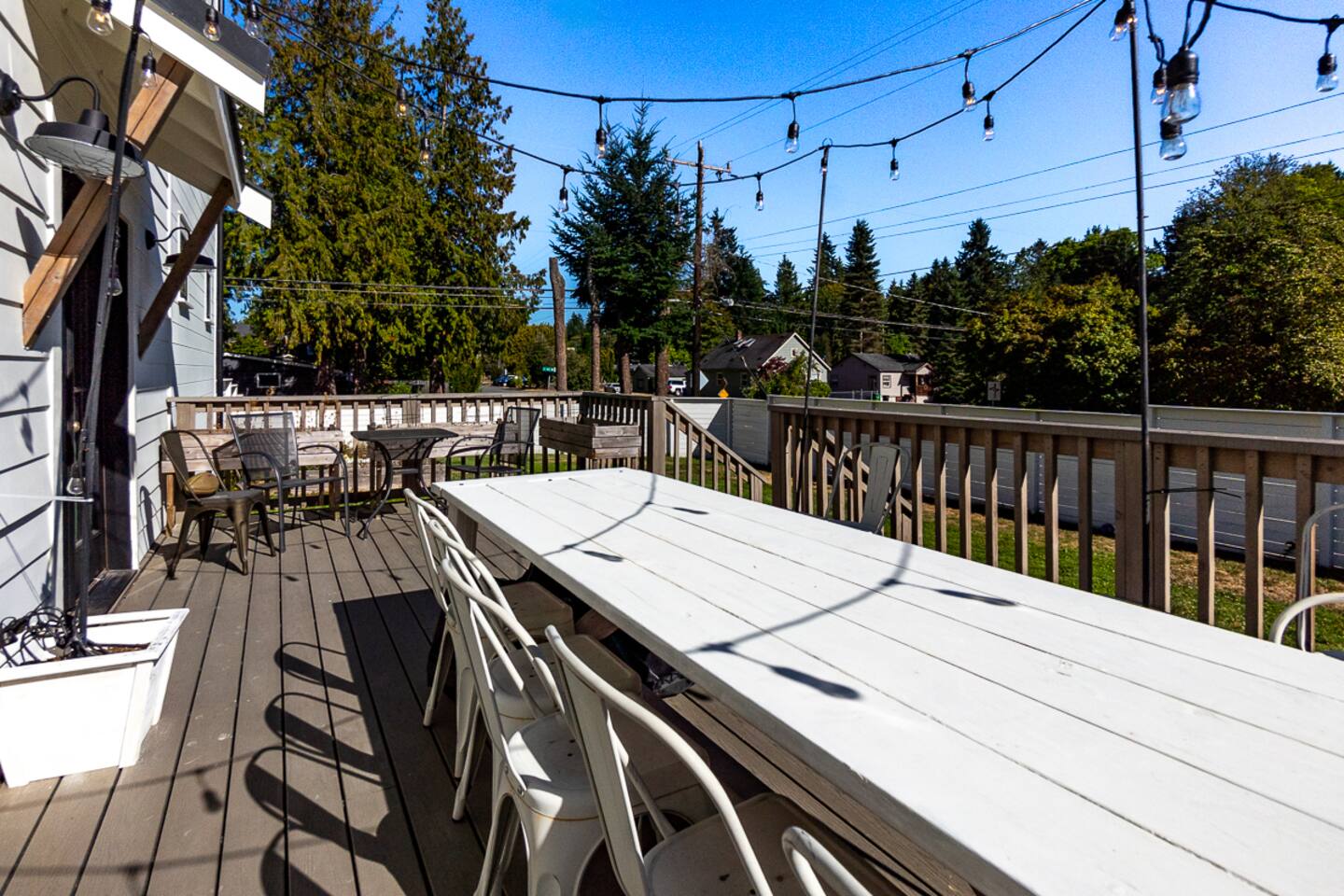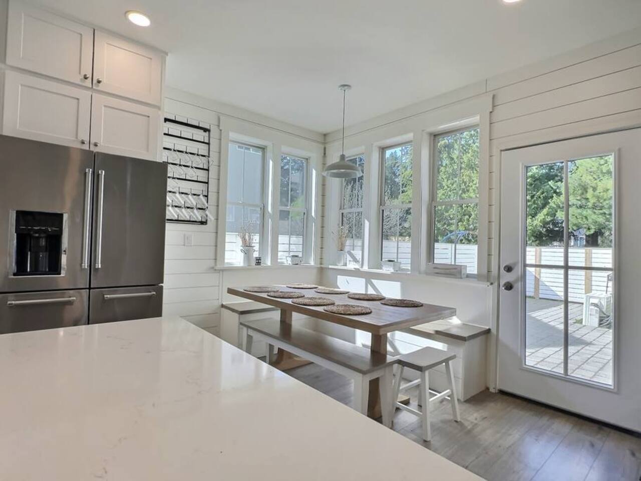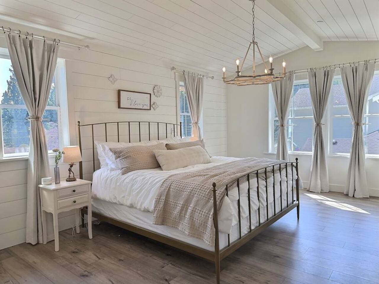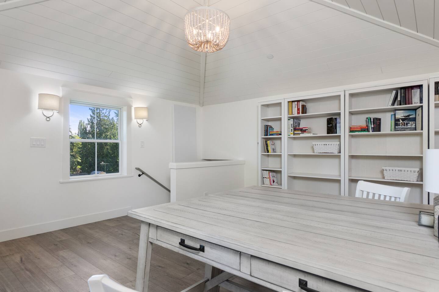 Welcome to Serenity at Shoreline, your invitation to gather, restore, and experience a slower rhythm—surrounded by beauty, comfort, and just the right touch of grace. Tucked in a quiet Shoreline neighborhood just north of Seattle, this modern white farmhouse was thoughtfully designed to hold both joy and stillness in equal measure. Driftwood tones, vintage touches, and sunlit spaces come together to create a stay that feels warm, grounded, and unforgettable. From shared meals around the oversized dining table to slow mornings with coffee in the garden, every inch of this home encourages you to soften, settle in, and stay awhile. Just blocks from the Shoreline light rail station, guests enjoy effortless access to both Seattle and Lynnwood, as well as quick connections to I-5 for convenient regional travel. At the heart of the home, you’ll find an open-concept living space with plush seating and a double-sided fireplace, connecting seamlessly to the chef’s kitchen. Outfitted with a six-burner range, island seating, and all the small appliances you might need, the kitchen is perfectly equipped for slow breakfasts, shared dinners, and everything in between. Just around the corner, a cozy theater room invites you to unwind with a favorite film or settle in for a movie night after a day of adventure. All common living spaces are located on the main floor—with the exception of the laundry room, which is tucked away for convenience. The home features five thoughtfully designed bedrooms and a third-floor crow’s nest den—each with its own character and charm. Whether you're hosting a large gathering, retreating with a smaller group, or simply seeking a quiet escape, there’s space to rest and reconnect in every corner. ________________________________________ Where You’ll Sleep 🌿 The Wisteria Suite — Main Floor, King Bed + En-Suite Bath This restful suite feels like a deep exhale—layered in muted light, gentle textures, and a quiet kind of elegance. Located on the main floor, it features a plush king bed, a private en-suite bathroom, and calming views of the cascading wisteria vines just beyond its windows. 🌲 The Driftwood Suite — Upper Floor, King Bed + En-Suite Bath A sanctuary in the sky. With vaulted shiplap ceilings and sun-drenched interiors, this upstairs suite offers both space and stillness. The five-piece en-suite bath features a decadent pedestal soaking tub, and a large TV makes it the perfect space for unwinding in comfort. 🕊 The Shoreline Room — Upper Floor, Queen Bed + Shared Bath Tranquil, simple, and serene, this queen bedroom is located near the shared hallway bath. Designed with early morning light and soft-toned stillness in mind, it’s a peaceful escape tucked just across from the Driftwood Suite. 🌙 The Sea Star Bunkroom — Upper Floor, 2 Twin-Over-Twin Bunks + Shared Bath Playful and cozy, this light-hearted space features two twin-over-twin bunk beds and plenty of charm. It’s ideal for cousins, siblings, or anyone young at heart. 🌸 The Hydrangea Room — Upper Floor, Queen Bed + En-Suite Bath Tucked toward the back of the home, this light-filled queen suite offers privacy and calm. It includes a private en-suite bathroom and a soft, muted palette. A TV makes it a perfect place to retreat and unwind. 🪶 The Lookout — Third Floor, Vaulted Den Perched at the very top of the house, this crow’s nest den is wrapped in treetop views. With vaulted ceilings and natural light, it’s perfect for journaling, quiet work, or creative solitude—your personal perch above it all. ________________________________________ Step outside into a fully fenced backyard where nature wraps around you like a gentle whisper. Twinkling lights twist above the outdoor dining space, hydrangeas bloom in blues and blush, and a soft green lawn invites you to slip off your shoes and feel the earth beneath your feet The home is equipped with everything you need for a seamless and comfortable stay: high-speed Wi-Fi, smart TVs, a full laundry room, luxurious linens, plush towels, and a curated starter supply of soaps and household essentials. Every space—every corner—has been arranged with care, wrapped in warmth, and built for ease. Reminiscent of classic townhomes and side-by-side estates, Serenity at Shoreline shares one wall with a neighboring private residence. Each home is fully self-contained, with its own private entrance, living quarters, yard, and parking—ensuring your stay feels peaceful, independent, and uninterrupted “Come as you are. Leave a little lighter.” This isn’t just a place to stay—it’s a gentle invitation to slow down, breathe deeper, and find a softer way of being, right here in the quiet heart of Shoreline.